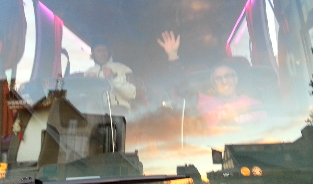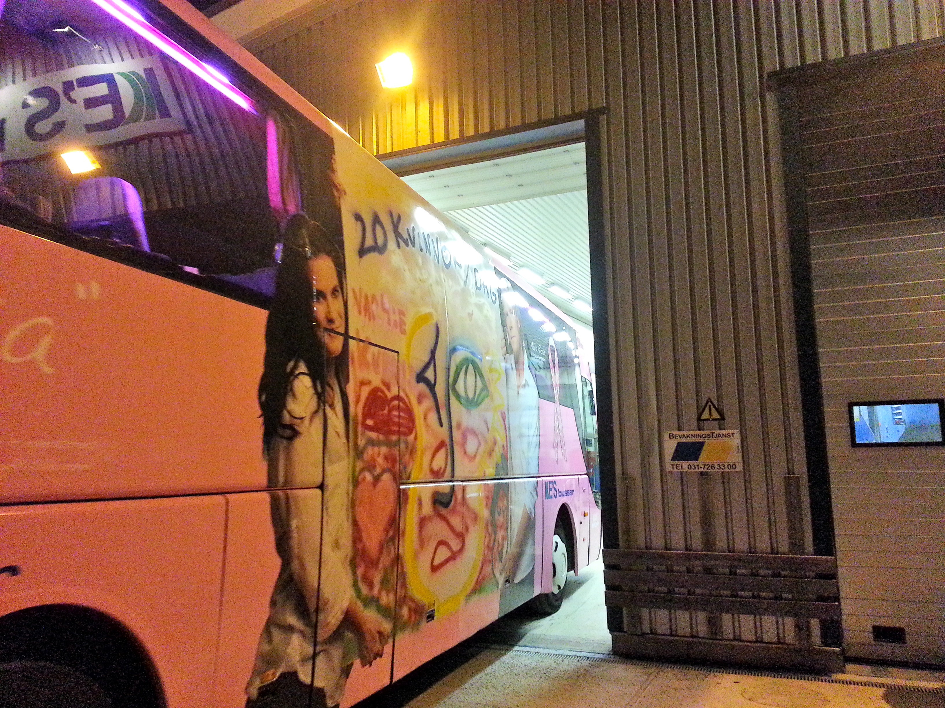 Vår fina buss har fått vila i värme i natt “hemma” i garaget på KE´S bussar i Kungsbacka, som faktiskt är med och bidrar med såväl buss som chaufför. Magnus, du är en klippa! Galet! Tusen tusen tack! Utan dig hade det här aldrig varit möjligt.