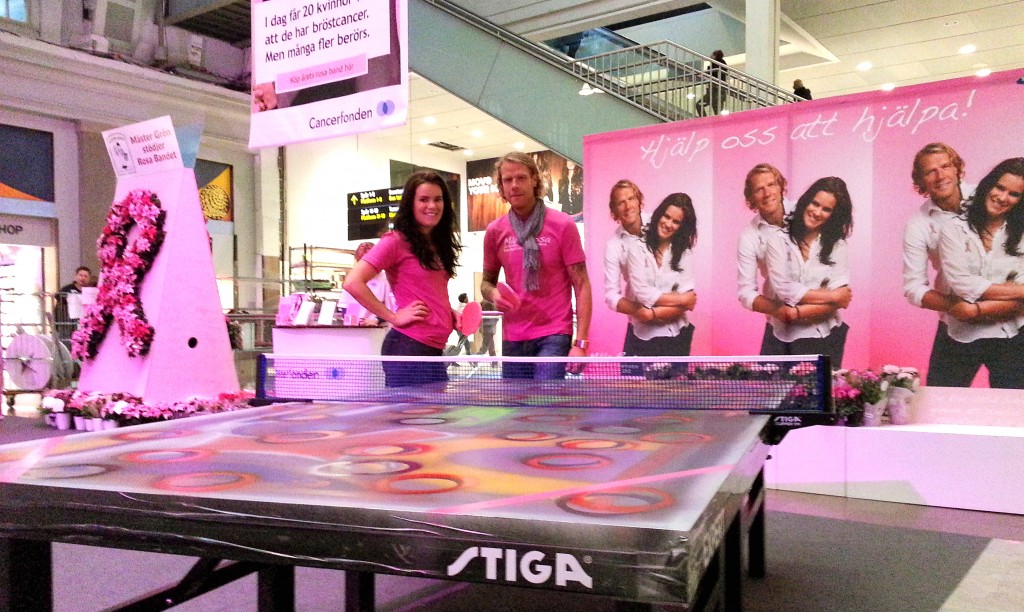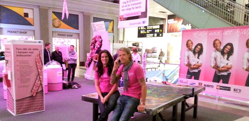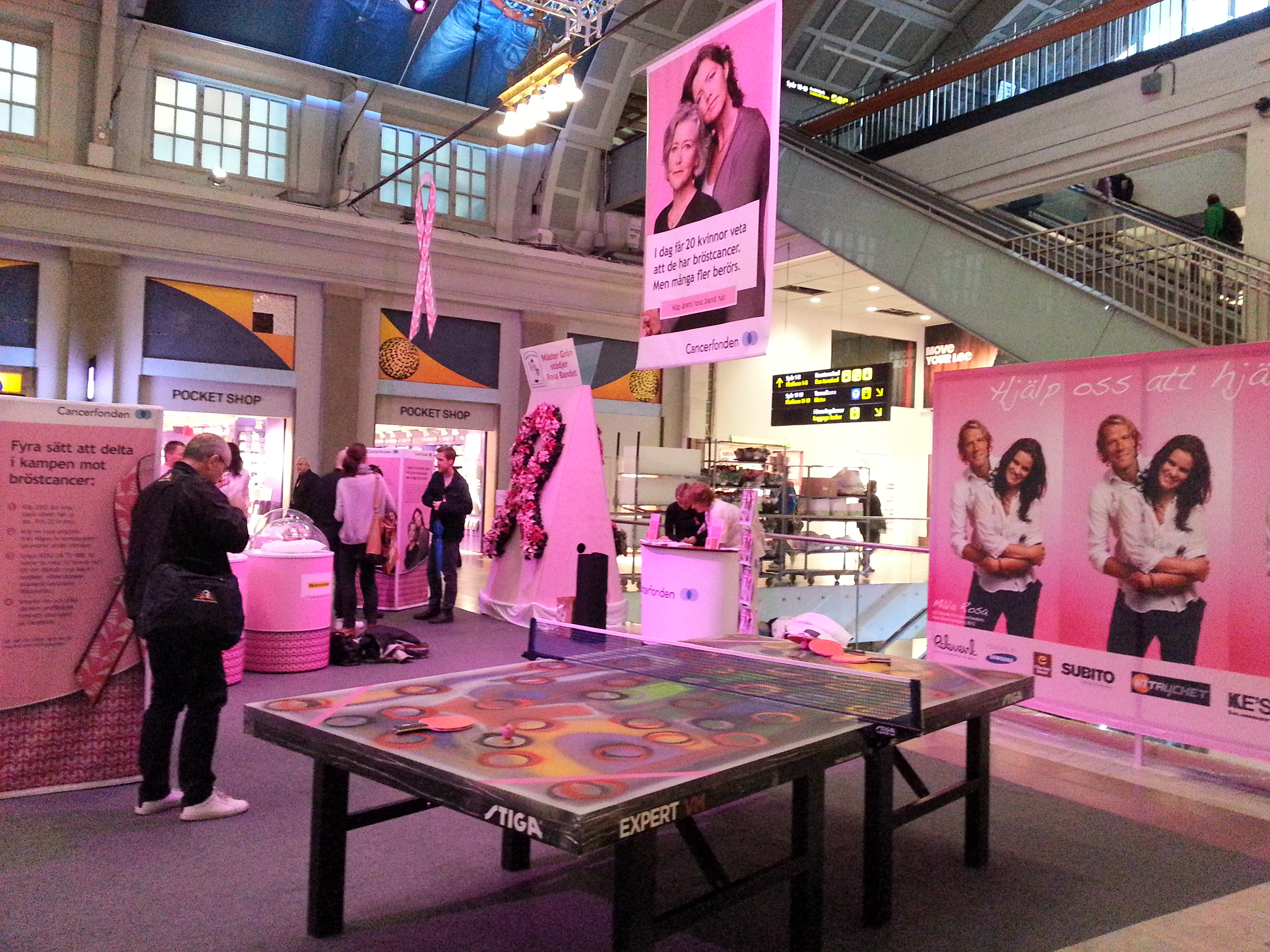 Idag är vi på Centralstationen och här säljs band och spelas pingis för fullt. Massor av folk! Ett VM-bord från Stiga. Visst är det coolt? Konstverk signerat Peter Sköld. Vi har även ett signerat Anna Benson som ni får se längre fram. Katarina Hultling som också är ambassadör är på plats och säljer rosa band.